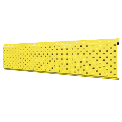 Линеарная потолочно-стеновая панель с ПЕРФОРАЦИЕЙ для вентиляции цвет RAL1018 Желтый применяется в качестве софитов для подшивы крыши, наружной и внутренней отделки потолков, стен, фронтонов фасада дома в Каменске-Уральском.