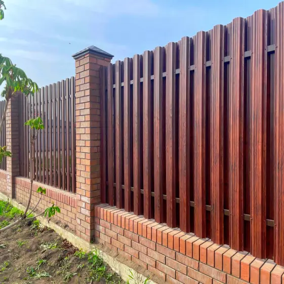 Забор Еврожалюзи Античное Дерево 3D Принтек двусторонний, Забор Еврожалюзи RAL8017 МАТТЕ Коричневый матовый двусторонний, Штакетник Полукруглый RAL8019 МАТТЕ Темный Шоколад двусторонний на заборе, Забор шахматка штакетник Широкий Античное Дерево 3D двусторонний, Колпак Everest Коричневый на столбах палисадника, Колпак Everest коричневый для столбов кирпичного забора