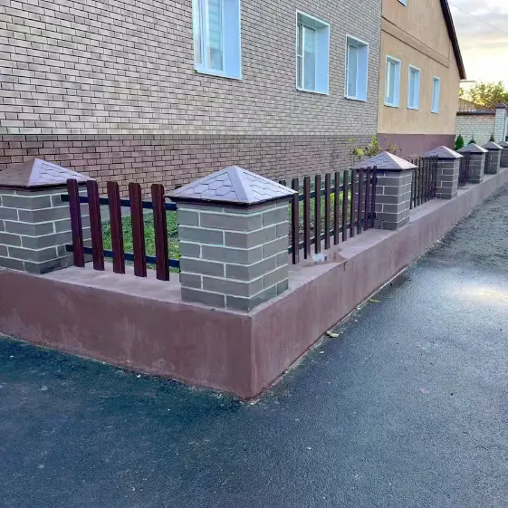 Забор Еврожалюзи Античное Дерево 3D Принтек двусторонний, Забор Еврожалюзи RAL8017 МАТТЕ Коричневый матовый двусторонний, Штакетник Полукруглый RAL8019 МАТТЕ Темный Шоколад двусторонний на заборе, Забор шахматка штакетник Широкий Античное Дерево 3D двусторонний, Колпак Everest Коричневый на столбах палисадника, Колпак Everest коричневый для столбов кирпичного забора